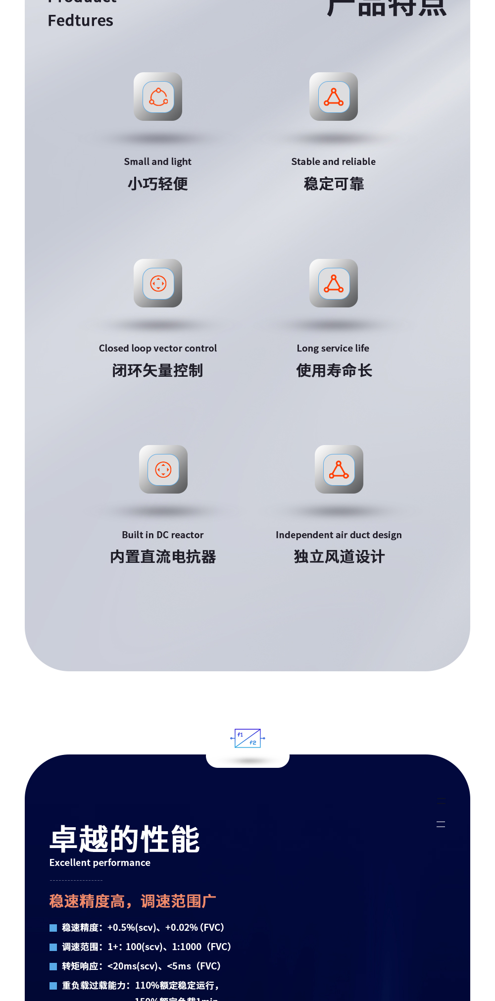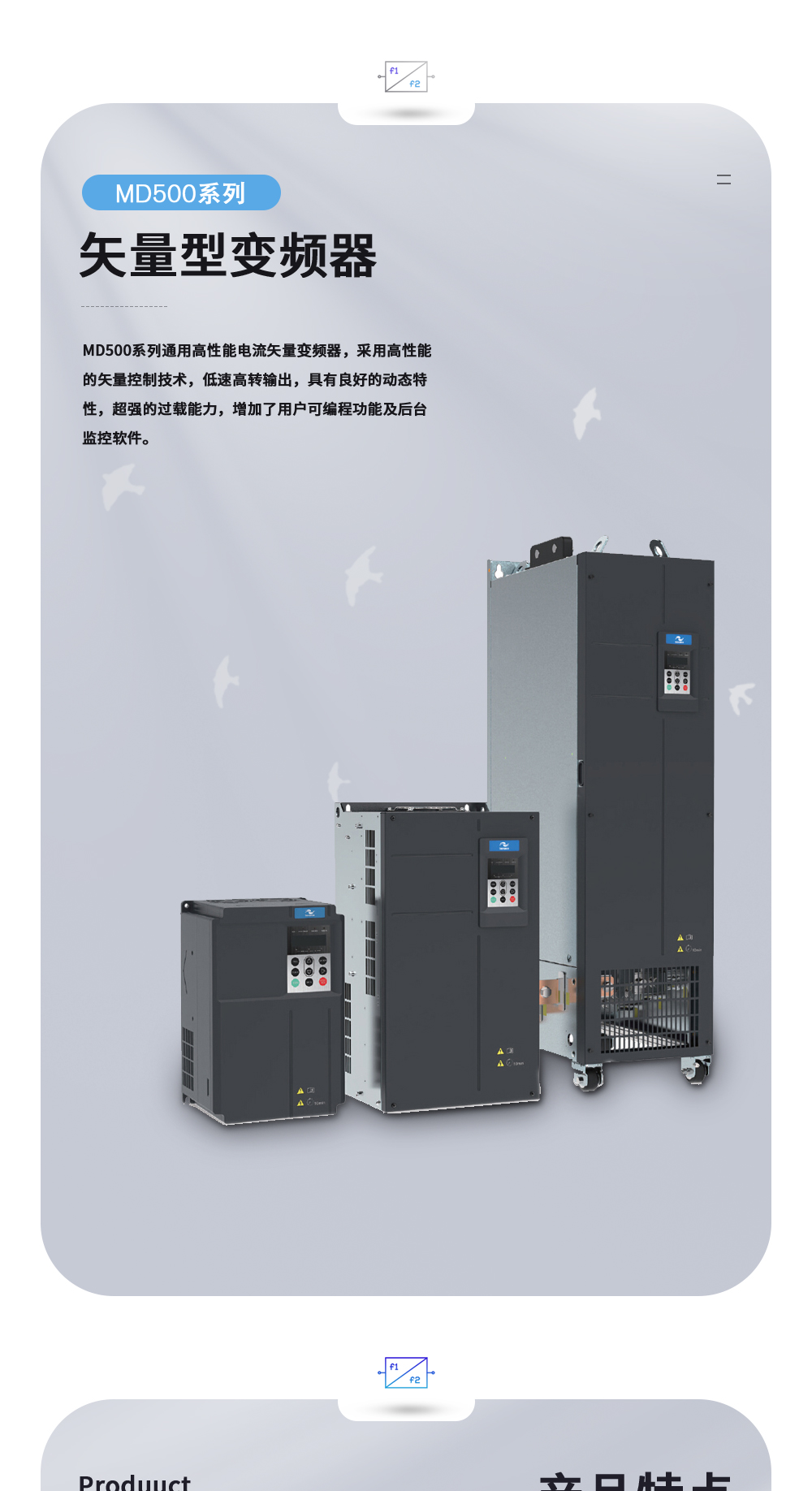 MD500系列變頻器是一款通用高性能(néng)電流矢量變頻器,主要用于控制和調節三相交流異步電機的速度和轉矩,是MD380系列的技術升級産品。MD500采用高性能(néng)的矢量控制技術,低速高轉輸出,具有良好(hǎo)的動态特性,超強的過(guò)載能(néng)力,增加了用戶可編程功能(néng)及後(hòu)台監控軟件